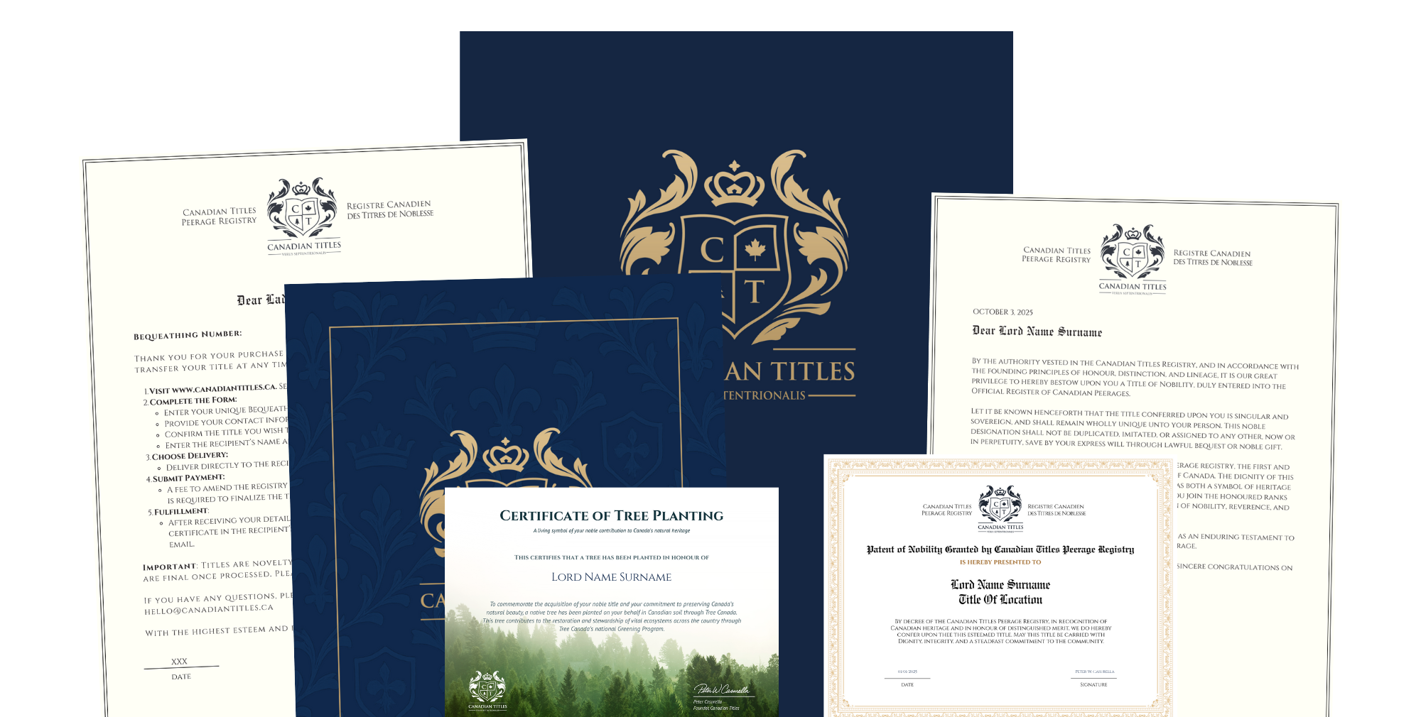 Canadian Titles is Canada’s official registry for Lord and Lady titles. Each title is tied to a specific municipality or neighbourhood, and only one of each rank is available per place. That means your title is completely unique—once it’s purchased, no one else can claim it. Every title is recorded in the Official Register of Canadian Peerages and can be passed down, gifted, or bequeathed to others.